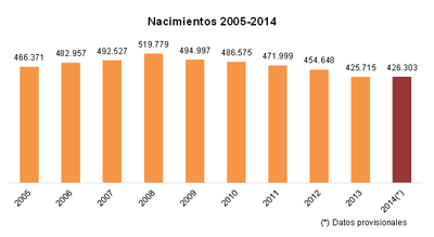 In addition, surveys carried out by the entity for the report show that, since 2008, when 519.779 children were born (maximum in 30 years), the number of births has fallen by 18%, and 2014, with 426.303 children a year in which it occurred the first increase since the last five years. However, the birth rate , with 9.1 births per thousand habitants, remains the same as that recorded in 2013, breaking the downward trend started in 2008.
